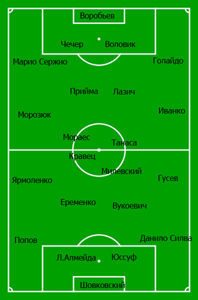 нтр поля будет бороться пара опорных полузащитников Лазич и Прийма. Роль правого хава сыграет Морозюк. По поводу левого полузащитника есть некоторые сомнения. До зимнего перерыва на левом фланге регулярно играл Соарес, на сборах же доверие тренера завоевал Иванко. Молодой украинец выглядел весьма уверенно, поэтому, вполне возможно, именно ему достанется место в основе. Хотя в полузащите может сыграть и Голайдо. В нападении же сыграет пара Танаса – Мораес.