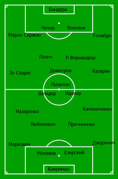 Наставник Металлурга Владимир Пятенко в плане выбора состава на игру является достаточно консервативным. Похоже, он окончательно определился с основной обоймой игроков и от матча к матчу проводит лишь точечные изменения. Итак, в воротах Металлурга место займет Александр Бандура. Рустам Худжамов, арендованный у Шахтера, продолжает греть скамейку запасных, и неизвестно, когда гл авный тренер предоставит ему шанс себя проявить. Линия обороны примет следующий вид: на правом фланге сыграет Марио Сержио, на левой бровке разместится Денис Голайдо, а в центре будут действовать главный антигерой поединка с Зарей Чечер, компанию которому составит Воловик. За опорную зону будут отвечать Лазич и Фернандеш. Что же касается атакующих хавов, то, думается, Владимир Пятенко отдаст предпочтение следующему варианту: Казарян – слева. Димитров – в центре, и Соарес – справа. А вот роль единственного форварда предстоит сыграть Маркосу Пизелли. Не стоит сбрасывать со счета молодого украинца Иванко и новичка команды Драмана Траоре, но оба эти исполнителя выглядели в прошлом туре весьма и весьма блекло, так что матч с Таврией наверняка начнут в запасе. К тому же Виталий сыграл целый тайм во вчерашнем поединке дублирующих составов.