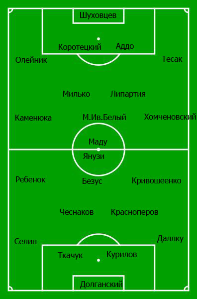 мя неплохо себя проявляет Белый (№25), все же центр обороны, который составляют Коротецкий и Аддо, смотрится надежнее. Логично было бы увидеть в основе в игре против бывшей команды Ярмаша, но на самом деле Григорий проигрывает конкуренцию партнерам на флангах обороны. Хотя если наставники выберут оборонительную тактику, то он может сыграть опорного полузащитника рядом с Липартией. Если Лазаровичу не удалось вернуться доверие Чанцева работой на тренировках, то в атаке мы вновь увидим Мадоу.
