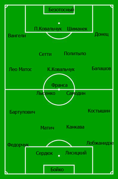 квалификацию Вангели, он сыграет справа в обороне вместо Кутаса. А вот с аргентинец Фонтанелло ситуация традиционно для украинского футбола непонятная. Он вроде бы наказан на три матча за удар соперника в неигровой ситуации, но на сайте ПЛ он в дисквалифицированных не фигурирует. Против Арсенала из-за повреждения не играл Лео Матос, сегодня он в строю и наверняка выйдет с первых минут.