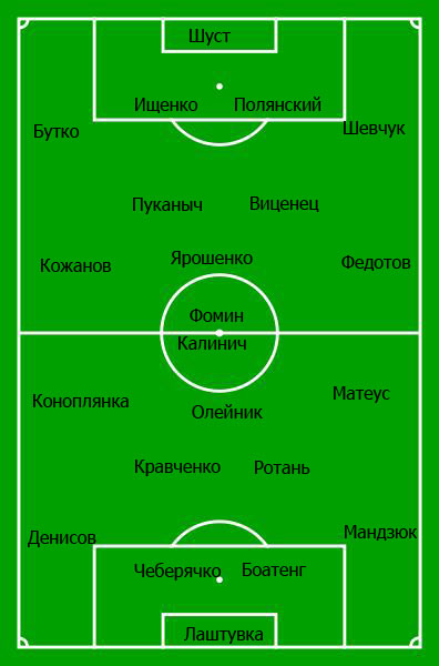 На острие атаки сыграет Калинич, а под ним будет традиционно три игрока. Точно среди них найдется место Коноплянке, а вот Матеус, Олейник и Кулаков поборются за два места. Причем, меньше всех шансов выйти с первых минут имеет как раз последний, игравший практически во всех поединках сезона, ведь в последних встречах он выглядел далеко не лучшим образом.