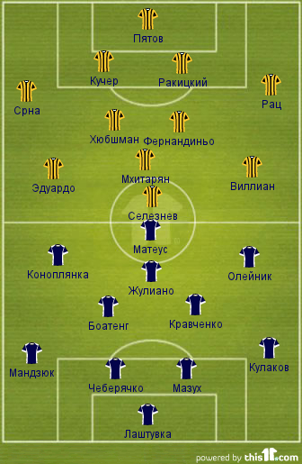 С составом у горняков также все в порядке. Дисквалифицированных нет, а в лазарете на данный момент находится Дмитрий Чигринский. Да и то, к числу полноценных больных защитника отнести нельзя – футболист просто не успел набрать оптимальную форму. Так что место в воротах займет Андрей Пятов. Четверку защитников составят Срна, Ракицкий, Кучер и Рац. За опорную зону отвечать будут Хюбшман и Фернандиньо. Ну, а в группе атаки сыграют Эдуардо, Мхитарян и Виллиан с Селезневым на острие. Хотя на позиции правого полузащитника возможны варианты. Коста, Илсиньо, Тейшейра – все готовы выйти на поле вместо бразильского хорвата.