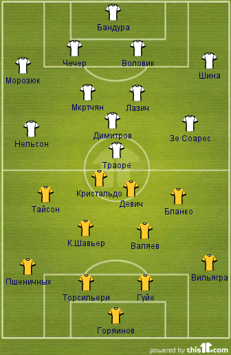 Скорее всего, наставник желто-синих сделает ряд изменений в составе своей команды по сравнению с последней игрой с греками. Во-первых, Мирону Богдановичу не придется рассчитывать на помощь дисквалифицированных Эдмара и Обрадовича. Да и лимит на легионеров оставит свой отпечаток на стартовом наборе футболистов. Так, в центре обороны, скорее всего, будет действовать пара Гуйе – Торсильери, на левом фланге сыграет гер