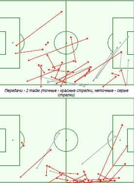 Фланговые защитники Таврии Анис Буссаиди и Юрий Путраш провели фактически зеркальные матчи. На рисунке их действия в каждом из таймов.