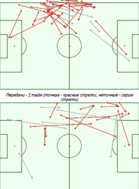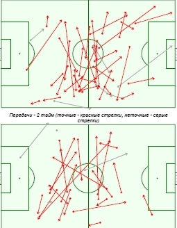 Демьяненко делает ставку в центре поля на связку Шарпар - Герасимюк, их умение придержать мяч и направить атаку в нужное направление. Против Металлурга Шарпар показал как раз ту игру, что от него ждет тренер. Он сделал больше всего передач в команде (68), больше него получил передач только Савич, а в атаках чаще принимали участие форварды Савич и Майкон. На рисунке видно, какой сейчас работой занимается Шарпар, и качество при этом достаточно высокое.