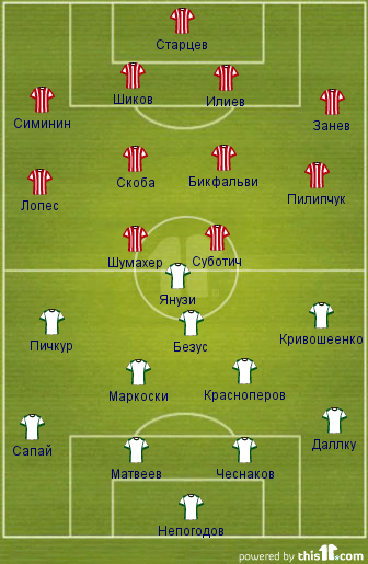 доволен действиями своей команды. Наверняка не случится большого количества изменений в составе по сравнению с первым поединком. Есть шансы увидеть сегодня на поле главную звезду Волыни прошлого сезона Майкона, ведь вчера за молодежный состав играли Савич и Павлов, а значит альтернативы основной паре форвардов первого тура Суботич - Шумахер не остается. А вообще ни одного изменения по сравнению с первым туром ждать не приходится.