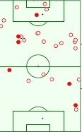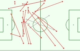 А ведь на самом деле оба наставника говорили не просто так. Действительно Кривбасс тактически грамотно построил игру, вынудив соперника ошибаться. На прошлой неделе мы отмечали даже где-то чрезмерный контроль мяча игроками Черноморца в домашней игре против Говерлы. Так вот сейчас одесситы помимо меньшего общего количества передач (488 против 646) еще и в их направленности заметно сдали. Например, тогда было девять владений мяча больше 45 секунд, а теперь всего одно. Зато с держанием мяча меньше пяти секунд ситуация изменилась в худшую сторону 48 против 66-ти. На ужасном одесском поле Черноморец сделал только 28 длинных передач, а в Кривом Роге их было сразу 47. Для команды, которая старается строить игру за счет коротких пасов это странное изменение. (см. рисунок - передачи Фонтанелло в первом тайме).
