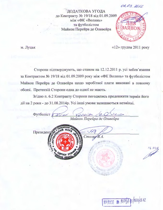 Поэтому начать следует с ноября 2011 года, когда Майкон де Оливейра подписал соглашение с новым агентом Трояном Гершизяном. Не бросая ни в кого копья, скажем, что игрок на тот момент был не очень доволен тренировочным процессом в Волыни и некоторыми условиями своего контракта, поэтому попросил Трояна подыскать ему новый клуб. В декабре прошлого года в Волыни уже знали о возможных организационных изменениях в клубе, а потому сообщили Майкону о них, предложив остаться в команде, а также пересмотреть некоторые условия контракта. Чего там скрывать: в том числе - финансовые. Эту принципиальную договоренность зафиксировали в Дополнительном соглашении к контракту от 1 сентября 2009 года, которую подписали 12 декабря 2011 года. Именно этот (на фото) документ засвидетельствовал желание Майкона остаться в Луцке до 31.08.2014 г.