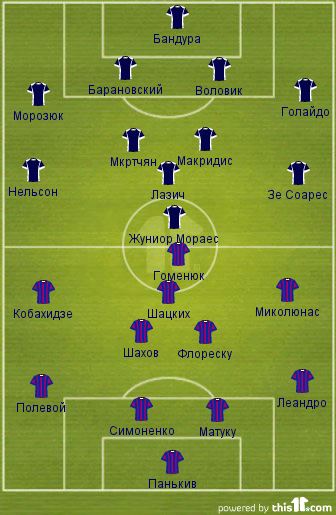 Неожиданностей стартовый состав Металлурга в себе таить не должен. В паре с Воловиком в центре обороны сыграет отлично зарекомендовавший себя Барановский. На месте опорника, наверняка, выйдет отбывший дисквалификацию Макридис. Есть определенные сомнения по поводу позиции левого полузащитника. Предположим, в основе найдется место для Соареса, а Казарян останется на скамейке запасных.