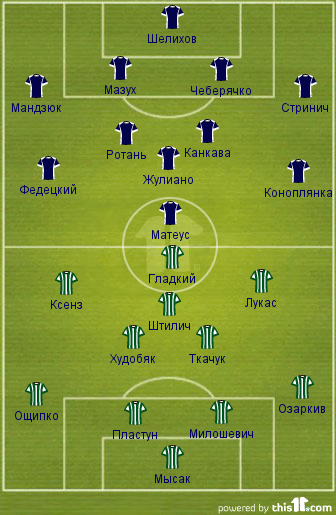 Лаштувку в воротах заменит Шелихов, а на острие атаки сыграет Калинич. Бесспорно, Коноплянка привычно сыграет слева в атаке, а вот справа против Наполи в частности себя здорово проявил экс-лидер Карпат Федецкий. Дальнейший выбор наверняка будет зависеть от здоровья Селезнева. Если даже он попадет только в запас, то Матеус может выйти с первых минут на позиции центрального атакующего хавбека. Дело в том, что без Селезнева и с Матеусом и Калиничем в старте у Рамоса просто не остается нападающих для усиления игры в случае необходимости. А испанец любит бросать в бой новых форвардов. Так что вполне вероятен вариант с трио Ротань - Канкава - Жулиано в центре полузащиты, и с Матеусом или Калиничем на острие атаки.