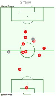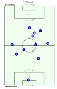 На графике усредненных позиций, приведенном рядом, видно, что Шахтер в первой половине встречи оказывал серьезное давление на слабую для динамовцев зону. Помимо Срны, Эдуардо и Фернандиньо там часто оказывался не только Мхитарян, но и приходивший с противоположной бровки Тайсон. Динамо же часто оказалось не готово к подобным смещениям — только в первом тайме Эдуардо отдал две острые передачи с правого фланга, а под конец тайма оттуда же пришел и гол в ворота Коваля.