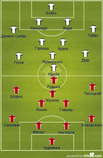 Киевляне потеряли сразу несколько игроков накануне этой встречи. Из-за дисквалификации выбыли из строя сразу три исполнителя, травмирован Безус, а состояние Гармаша не может быть оптимальным после травмы. В то же время только два человека из молодежного состава киевлян не принимали участие во вчерашней встрече. Однако ждать Буяльского или Каливтинцева в стартовом составе нет никакого смысла. Скорее, Блохин рискнет выпустить Гармаша и вновь поставит Аруну. Также с первых минут ожидается Дуду, возможно, вместе с Гусевым и Ярмоленко, что приведет к постоянному перемещению игроков в линии атаки.