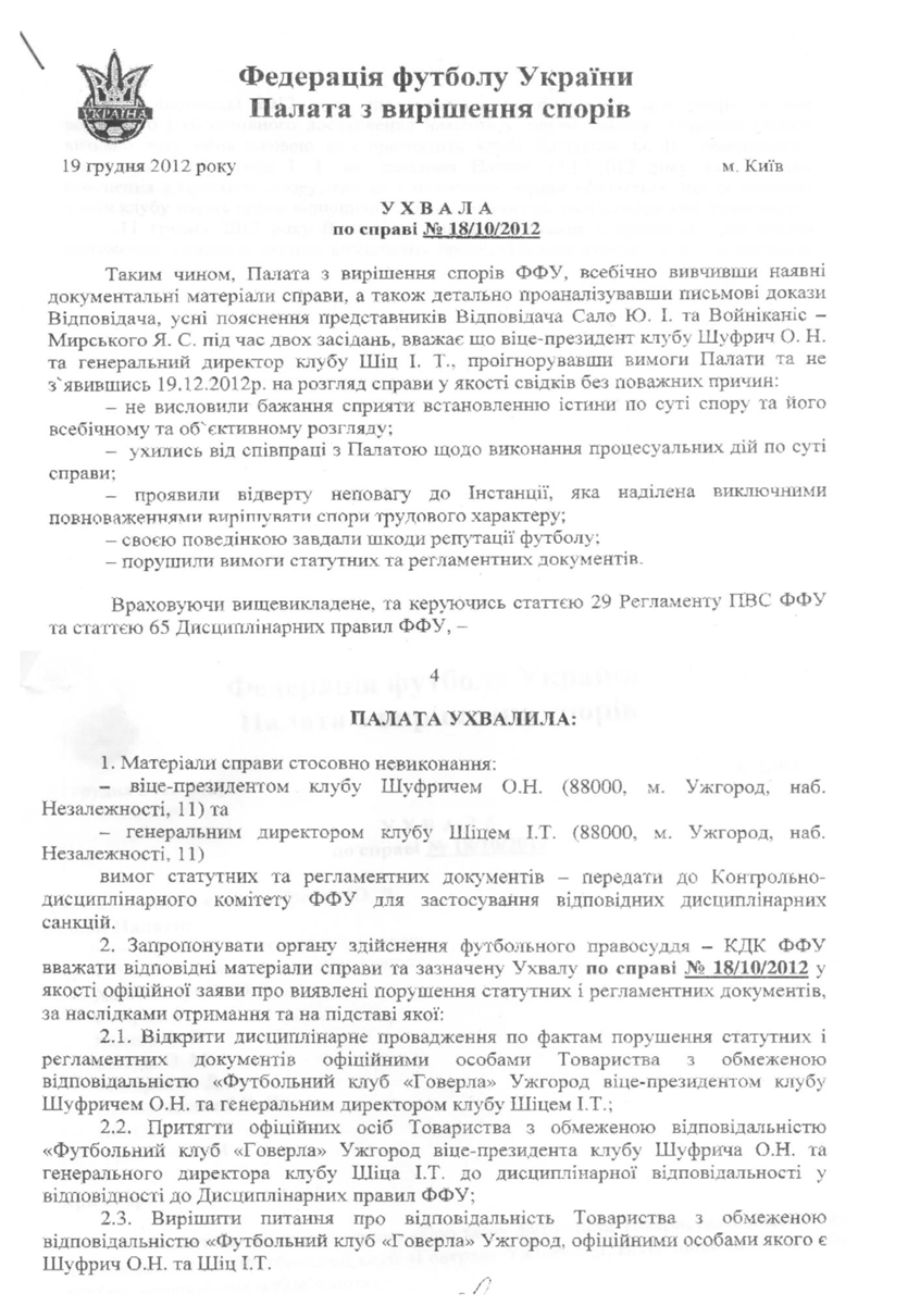 - Я не могу ответить на этот вопрос. Могу только догадываться. Лучше уточнить в ФФУ. Я лишь точно могу сказать, что 14 мая меня уведомили, что клуб оштрафовали за невыполнение решения Палаты, а на следующий день Говерле выдали аттестат.