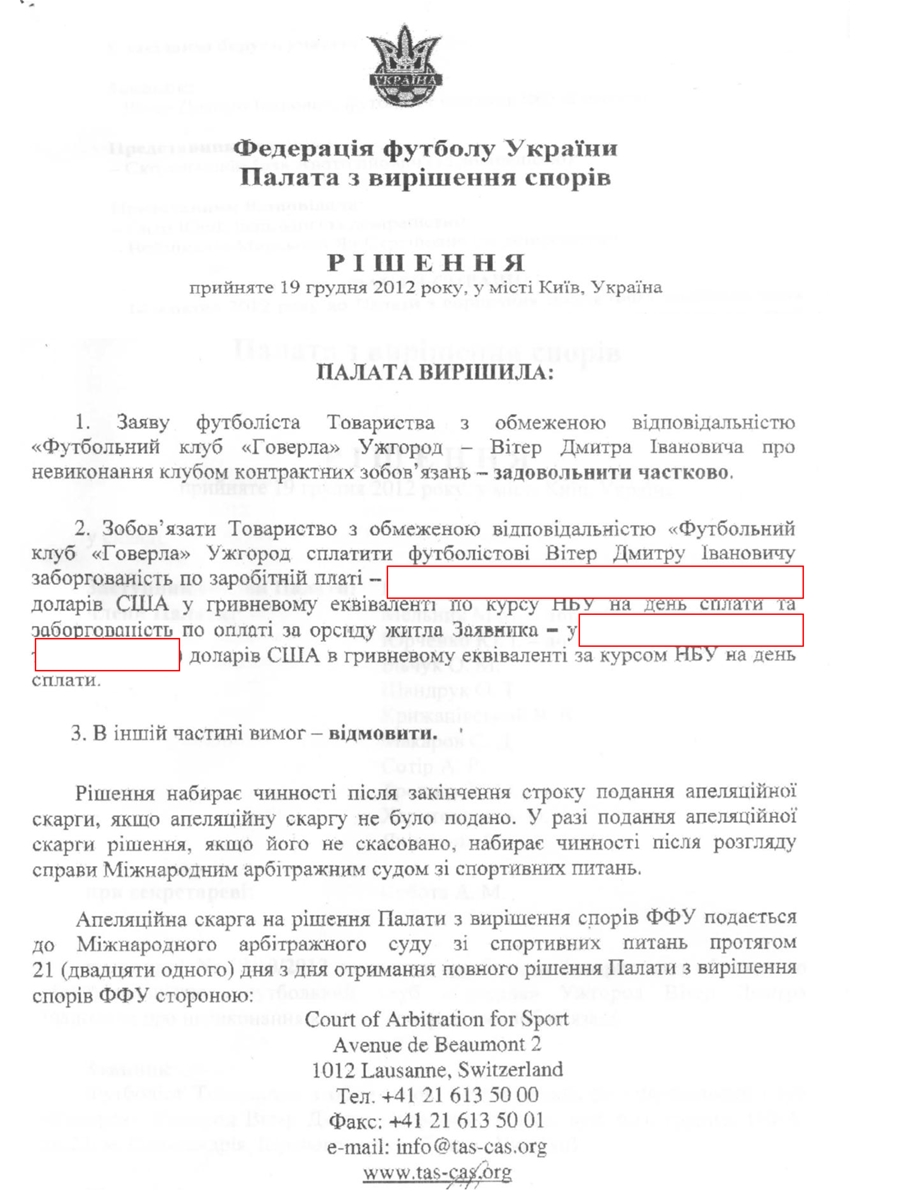 - Да. Было три заседания. На первых двух этот вопрос только рассматривали и изучали, а на третьем мы с юристом выиграли этот спор частично. Клуб обязали выплатить мне заработную плату по тарифу, который я должен был получать в первой лиге несмотря на то, что в Премьер-лиге моя зарплата должна была быть больше. Говерлу обязали рассчитаться со мной с июня по декабрь 2012 года, но денег клуб еще так и не заплатил.