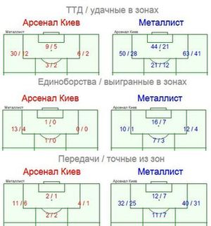Да, один мяч они все-таки забили, у того же Гоменюка был еще один момент, но это все же было больше следствием какого-то сумбура и ошибок соперников, нежели комбинаций и эффективных действий на чужой половине поля. Рядом приведены сравнительные характеристики обеих команд вблизи чужих ворот, где отчетливо видно, насколько мало опасности исходило воротам Александра Горяинова.