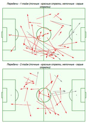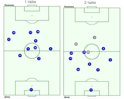 А во втором тайме Днепр заметно опустился ниже (см. график усредненных позиций по таймам), выбрав контратакующий стиль, который так к лицу этой команде. А там и второй мяч подоспел, правда, пусть и со стандартного положения.