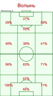 Донецкий Металлург всегда был известен своим умением атаковать через центр. Порой даже вызывало некоторые вопросы такое стремление играть исключительно через центр. В прошлых матчах при Сергее Ташуеве ситуация не особо менялась, большинство своих атак дончане проводили через середину поля. Против Волыни то ли так получилось, то ли план на игру был построен, чтобы команда больше атаковала флангами. Вместо традиционных 40-45% только четверть атак команды проводилась через центральную зону.