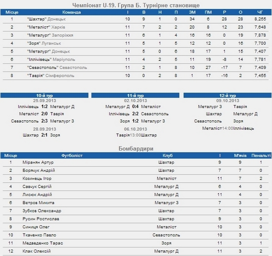 В группе Б один матч не состоялся из-за участия донецкого Шахтера в юношеской Лиге чемпионов — игра в Крыму с Таврией пройдет шестого числа. Но учитывая турнирное положение крымчан и их 1-17 в графе забитые-пропущенные мячи — три очка в копилку Шахтера можно записывать уже сейчас. Но и без них Горняки уже давно решили свои проблемы. То же можно сказать и о харьковском Металлисте, который разгромил на выезде крепкий и бескомпромиссный (ни одной ничьи) донецкий Металлург. Очередной гол (с пенальти) записал на свой счет Игорь Козинец, который продолжает гнаться за двумя бомбардирами из донецкого Шахтера Мираняном и Борячуком, которые, правда, имею отличный шанс пополнить свой актив за счет выезда к Таврии.