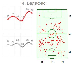 А вот у Балафаса цифры просто прекрасные. 100 удачных ТТД (общий брак — 22%), 34 выигранных единоборства из 42-х (30 — в обороне), девять отборов, всего семь потерь мячь и пять заработанных фолов.