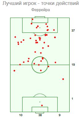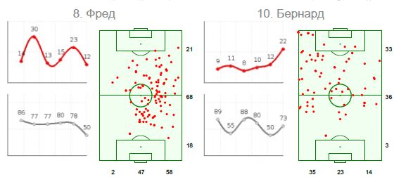 Что касается вовлеченности в игру, Фред у Шахтера был одной из наиболее заметной фигур. Ему чаще всего выполняли передачи (70), он выполнил наибольшее количество ТТД (81 удачное при общем браке в 24%) и по участию в единоборствах "проиграл" только Феррейре. Но, в отличие от Фернандиньо, процент выигранных единоборств у него оказался не очень высок (43%), да и обострений в итоге вышло маловато (одна точная острая при одной попытке).