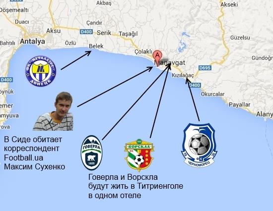 Уже много лет большинство любителей украинского футбола, наблюдая за работой своих кумиров в Турции, думают, что наши коллективы заезжают пачками в один-два отеля и при первом же случае проводят между собой спарринги. Действительно, в сообщениях о зимних сборах фигурируют только названия городов Сиде и Белек, находящихся возле Анталии. Поэтому не сложно предположить, что коллективы УПЛ располагаются рядом, и каждый день друг другу машут ручкой через забор. Однако это — заблуждение. Несмотря на близость тех же Белека и Сиде (расстояние между ними около 30 км), на самом деле поле действий наших клубов во время зимних УТБ растягивается едва ли не сотню (а то и больше) километров!