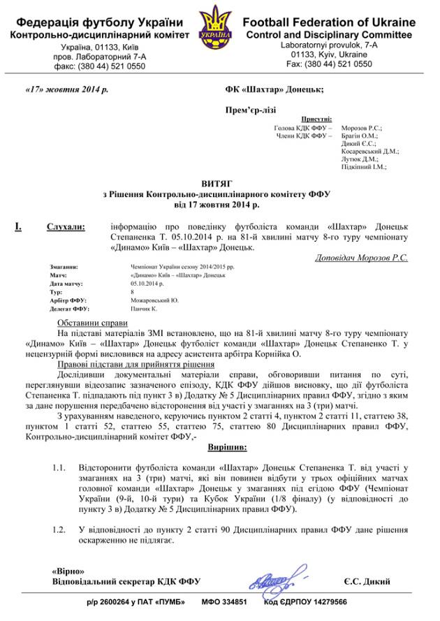 "Для того чтобы разобраться в этом вопросе, необходимо вернуться к хронологии событий. 17 октября в 12:00 состоялось заседание КДК ФФУ, на котором было принято решение отстранить Степаненко на три матча. Полный текст вердикта был направлен в Премьер-лигу: в нем перечислены конкретные матчи, от участия в которых отстранен Степаненко, в чем могут убедиться все желающие. Во второй половине того же дня Премьер-лига получила письмо от МВД с просьбой о переносе всего 10-го тура на более поздние сроки в связи с проведением в стране выборов народных депутатов. На основании этого Дирекция приняла соответствующее решение вечером того же дня".