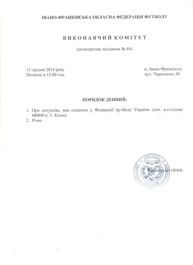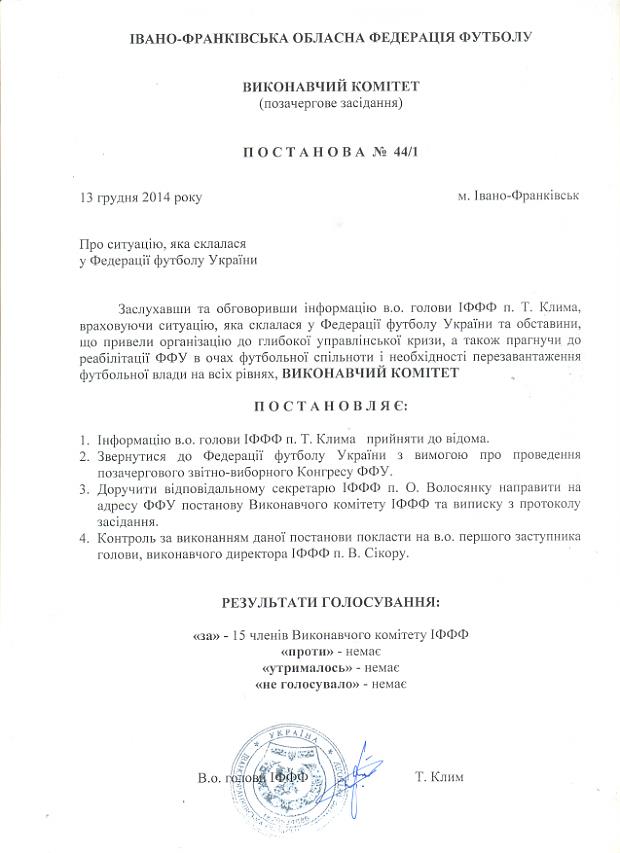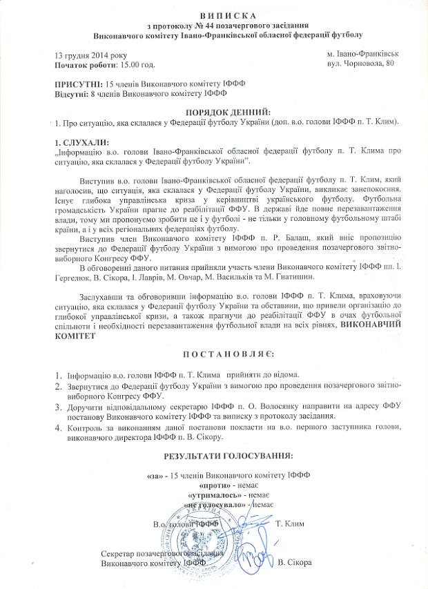 "И.о. главы Ивано-Франковской областной федерации футбола Тарас Клим отметил, что ситуация, сложившаяся в ФФУ, вызывает обеспокоенность. Существует глубокий управленческий кризис в руководстве украинского футбола. Футбольная общественность Украины желает реабилитации ФФУ. В государстве идет полная перезагрузка власти, поэтому мы предлагаем сделать это и в футболе – не только в главном футбольном штабе страны, но и во всех региональных федерациях футбола", — говорится в документе.
