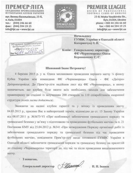 УПЛ просит в кратчайшие сроки сообщить, готово ли МВД обеспечить общественный порядок и безопасность на прилегающей к стадиону Черноморец территории до, во время и после проведения матча, говорится в копии письма, которое опубликовал сайт pobeda.od.ua.