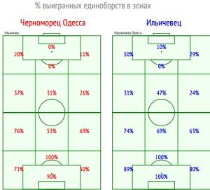 Показатели команд характерны для проигравшего в одни ворота со счетом 0:3. На графике интересно отметить количество выигранных единоборств в последней трети для обеих команд.