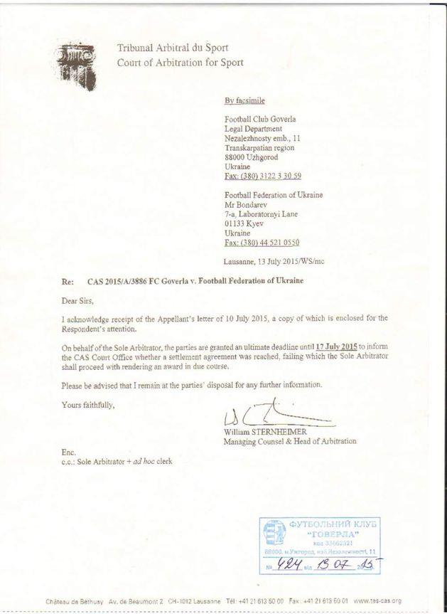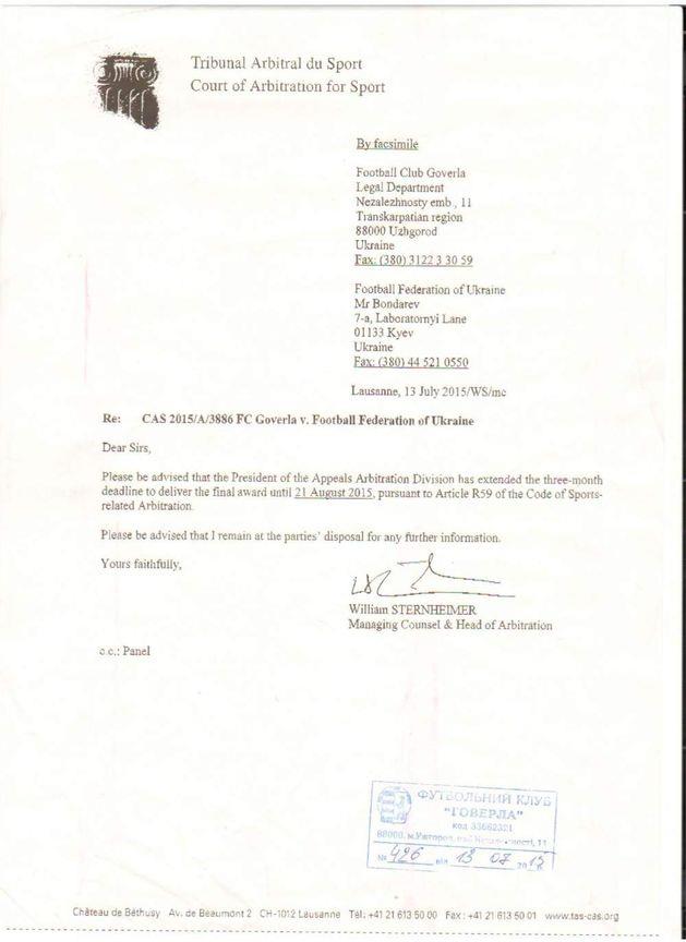Також листом від 13.07.2015 р. САС повідомив, що остаточне рішення у даній справі буде прийнято та направлено сторонам не пізніше 21.08.2015 р.