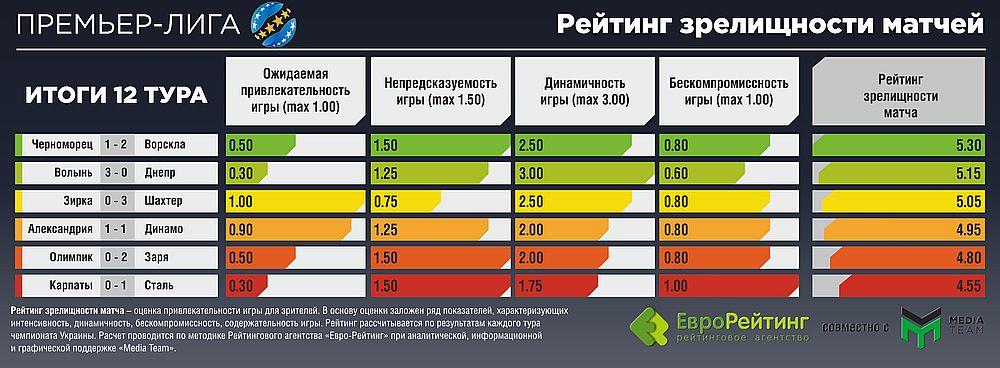 По методике Рейтингового агентства Евро-Рейтинг была оценена зрелищность матчей 12-го тура чемпионата Украины.