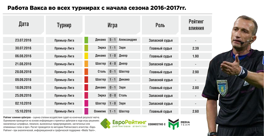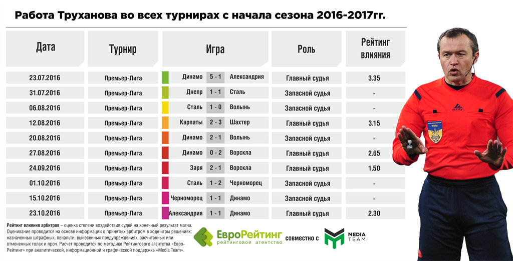 Труханова Евро-Рейтинг уже представлял в прошлом превью. Матч Александрия-Динамо Константин отсудил качественно – рейтинг влияния составил 2,30 балла, что улучшило и его итоговую оценку. В рейтинге влияния арбитров по итогам 12-ти туров он переместился на вторую позицию со средней оценкой в 2,59 балла.