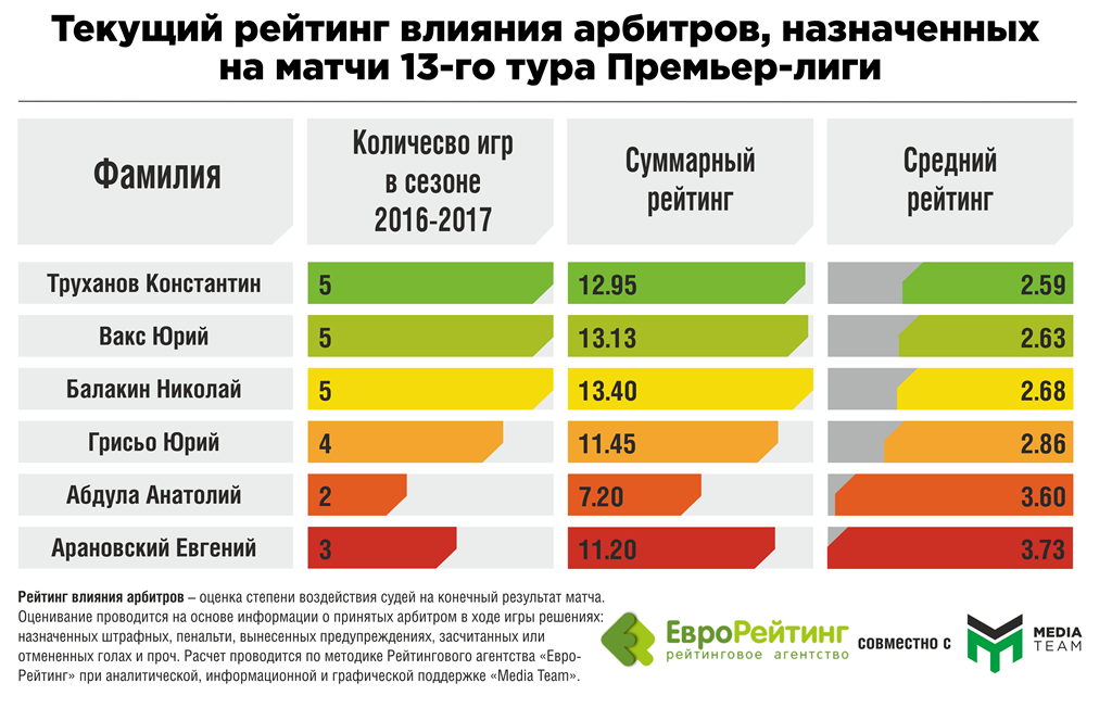 Рисунок 3. Текущий рейтинг влияния арбитров, назначенных на матчи 13-го тура Премьер-лиги