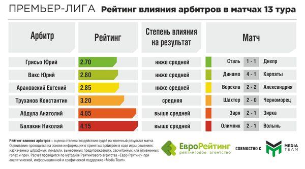 Евро-Рейтинг анализирует действия арбитров в 13-м туре текущего чемпионата Украины.