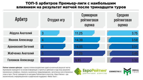 В рейтинге влияния арбитров в пятерке лидеров "влияния" Арановский и Абдула поменялись местами. Теперь пелетон возглавляет Анатолий, а у него "на колесе" расположился Александр Иванов. Покинуть первое место Абдуле будет непросто – до конца чемпионата осталось не так много игр. А насколько активно будут его привлекать к судейству, зависит от оценки Комитетом арбитров его работы в последней игре (особенно, в эпизодах с неназначением пенальти). Арановский, благодаря качественной работе опустился сразу на две позиции вниз.