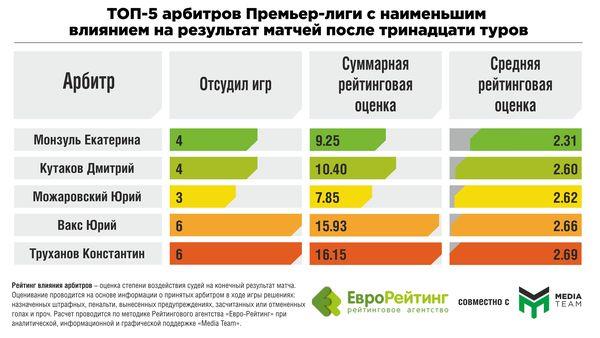 Рейтинг влияния арбитров – мнение Рейтингового агентства о степени воздействия судей на конечный результат матча. Определение рейтинга проводится на основе информации о принятых арбитром в ходе игры решениях: назначенных штрафных, пенальти, вынесенных предупреждениях, засчитанных или отмененных голах и проч.