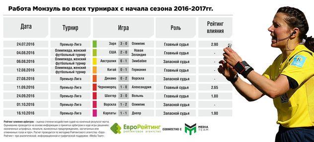 Интересно отметить, что Монзуль, которая начала привлекаться к судейству в Премьер-лиге с 2011 г., в качестве главного арбитра работает только с весны 2016 г. До этого она выступала лишь в качестве запасного, а также судила в первой и второй лигах. Всего Катерина отработала главным арбитром в 7 матчах, из них 4 – в нынешнем первенстве. Отличительная черта – умеренная жесткость при сохранении контроля над игрой. В среднем показывает 3 желтые карточки за матч. В семи поединках лишь раз предъявила красную карточку и ни разу не назначала пенальти.