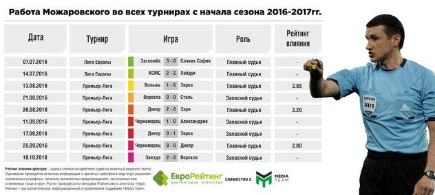 Несмотря на опыт судейства каждого из двух клубов в отдельности, за пять последних лет Можаровский не обслуживал встречи между ними. Предыдущая статистика этого рефери указывает на низкую вероятность назначения пенальти (в 2016 г. – лишь однажды) и предъявления красных карточек (три за весь 2016 г, все – в матче Шахтер-Динамо). Сдержан Можаровский и в вынесении предупреждений: обычно, не более трех за игру. Поэтому, высока вероятность, что и данный поединок пройдет очень скромно в плане наказаний.