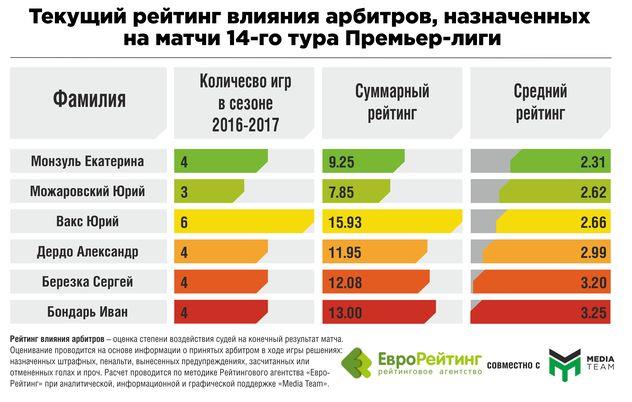 Рисунок 3. Текущий рейтинг влияния арбитров, назначенных на матчи 14-го тура Премьер-лиги