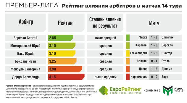 Евро-Рейтинг анализирует действия арбитров в 14-м туре текущего чемпионата Украины.