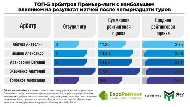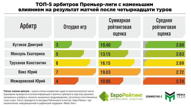 Рейтинг влияния арбитров – мнение Рейтингового агентства о степени воздействия судей на конечный результат матча. Определение рейтинга проводится на основе информации о принятых арбитром в ходе игры решениях: назначенных штрафных, пенальти, вынесенных предупреждениях, засчитанных или отмененных голах и проч.