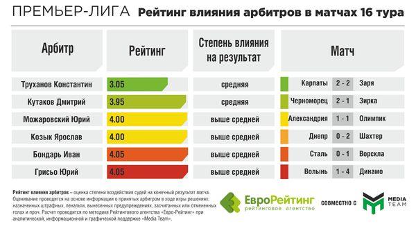 Череда судейских ошибок привела к изменению мест рефери в Рейтинге влияния арбитров. Поскольку большинство судей, которые были назначены судить в 16-м туре, имели хорошие результаты, ТОП-5 самых влиятельных арбитров практически не изменился. Не очень уверенно судящий в последнее время Бондарь вошел в его состав, вытеснив Сергея Бойко. На пороге уже переминается с ноги на ногу Козык, хотя ему еще нужно "постараться" в паре встреч.