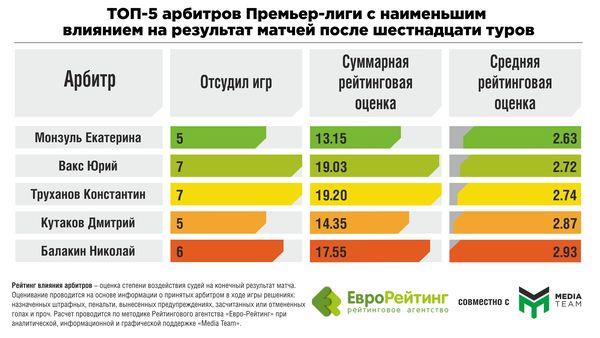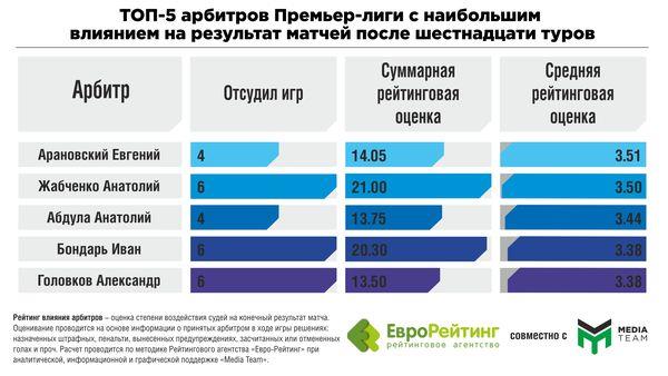 Рейтинг влияния арбитров – мнение Рейтингового агентства о степени воздействия судей на конечный результат матча. Определение рейтинга проводится на основе информации о принятых арбитром в ходе игры решениях: назначенных штрафных, пенальти, вынесенных предупреждениях, засчитанных или отмененных голах и проч.