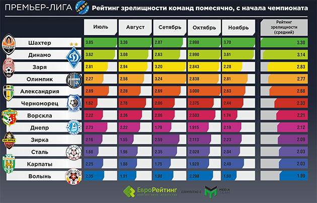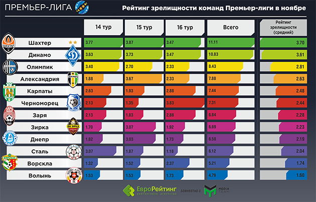 В целом же результаты рейтинга зрелищности свидетельствуют о следующем: Шахтер и Динамо вышли на пик формы в ноябре, достаточный для того, чтобы показывать качественную игру в национальном первенстве. Вероятно, в декабре они смогут сохранить свои позиции. Возможно некоторое ухудшение результатов Александрии и Олимпика: команды могут и не сохранить стабильность на длительной дистанции. Результаты Зари говорят о том, что клуб прошел пик формы и в декабре также не будет демонстрировать качественный футбол. Самой непонятной остается ситуация с Карпатами: или они начинают меняться или мы наблюдаем временный всплеск, связанный со сменой тренера. Что касается остальных команд чемпионата, то стабильную игру никто из них не демонстрирует.