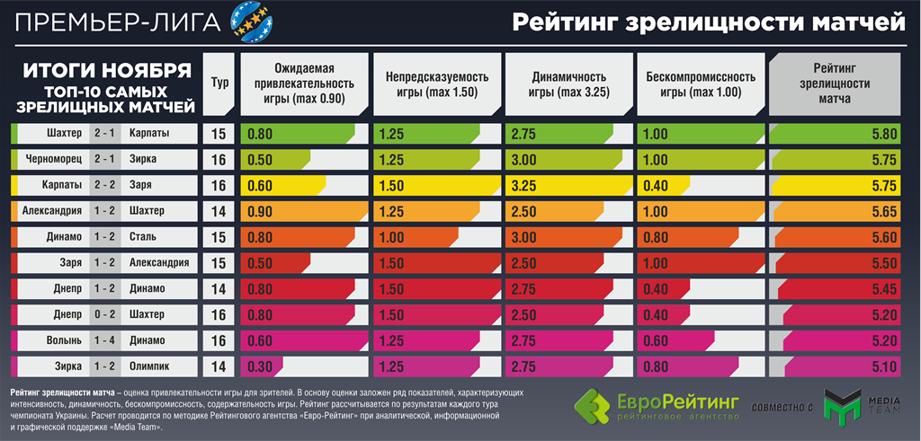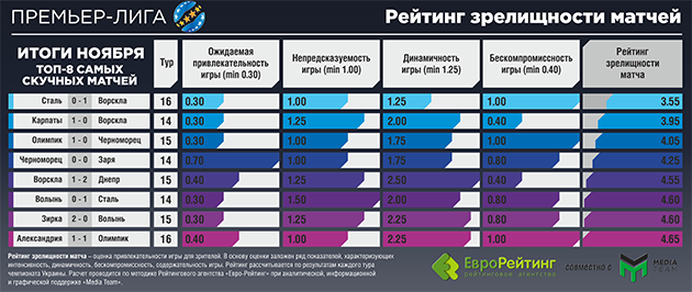 В ноябре не было игр, рейтинговая оценка которых превышала бы 6 баллов. Самый зрелищный матч – Шахтер-Карпаты набрал 5,80 баллов (самая зрелищная игра октября, Ворскла-Александрия – 5,90 баллов). Интересных поединков в ноябре было немало, при этом многие из них получали высокую оценку из-за непредсказуемости итогового результата.