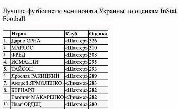 Интересно, что, кроме Срны и Марлоса, в топ-10 лучших футболистов УПЛ по версии InStat Football вошли еще 6 игроков команды Паулу Фонсеки и 2 представителя киевского Динамо — вингер Андрей Ярмоленко и защитник Евгений Макаренко.
