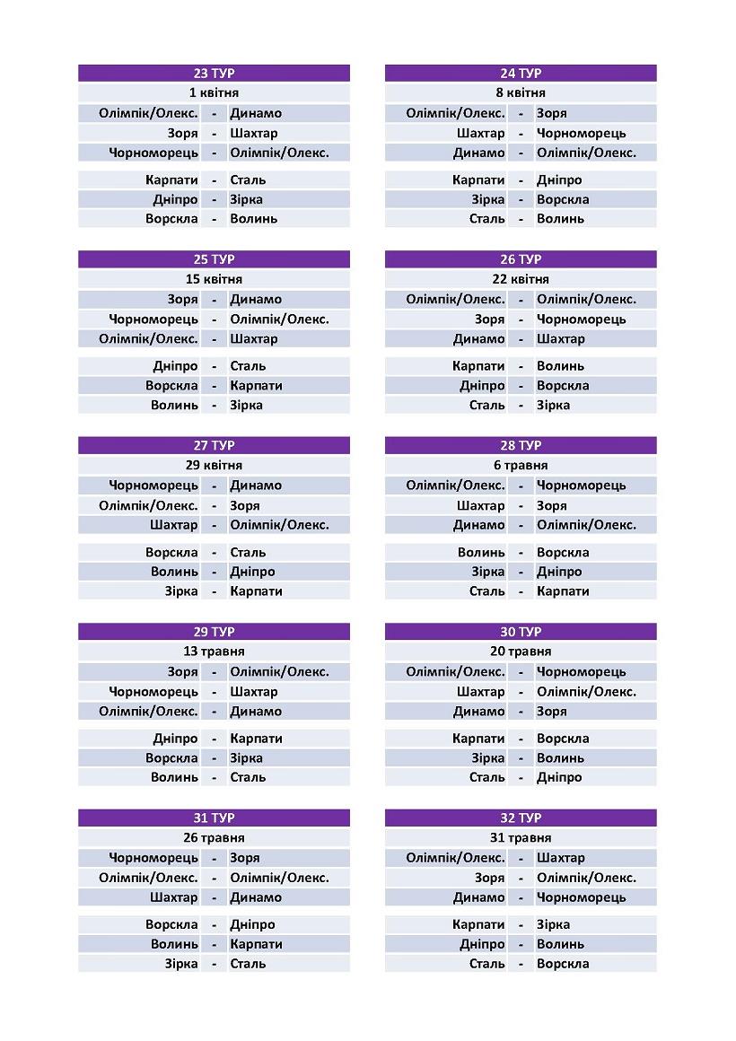Окончательный календарь станет известен 26-го марта, после того, как Олимпик и Карпаты проведут перенесенный поединок 17-го тура.