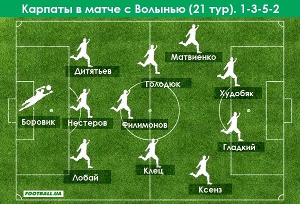 На данный момент в нашем чемпионате на постоянной основе 3-5-2 используют Карпаты. Олег Дулуб начал свою работу во Львове с поиска идеального формата для своей команды и использовал в первых своих поединках 4-5 игровых схем, меняя их в том числе по ходу поединков. Испробовав впервые 3-5-2 в матче против Шахтера 19 ноября прошлого года, в последующих поединках тренер всего дважды отказывался от этой схемы. Но ни Черноморцу, ни Олимпику команда не смогла даже забить, не говоря уже о победах. Сам тренер в одном их интервью сказал о том, что больше всего ему нравится 4-3-3, позволяющие играть в более зрелищный и атакующий футбол. Но факты налицо – последние удачные матчи и отличные результаты связаны напрямую исключительно с игрой в три центральных защитника и латералями.