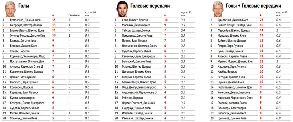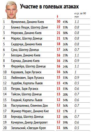 С большим отрывом Ярмоленко лидирует в таком статистическом показателе, как участие в голевых атаках. Таковых у капитана Динамо насчиталось 30 штук, а это означает, что он принял участие в 43% голов команды. Такой же процентный показатель имеет полузащитник Карпат Игорь Худобяк (15).