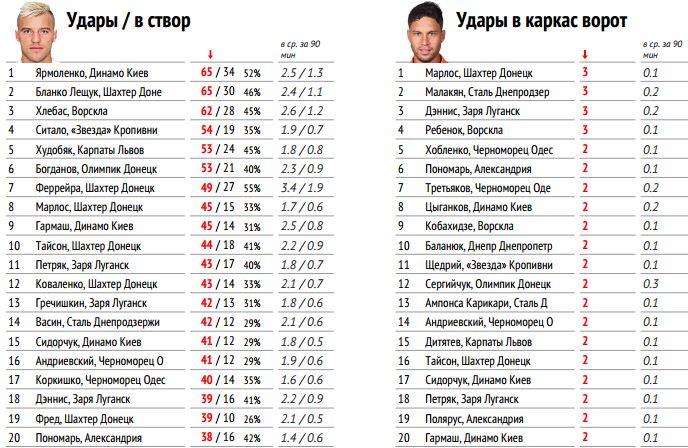 Все тот же Ярмоленко стал автором наибольшего количества ударов по воротам во всем украинском первенстве. Причем больше половины его ударов приходились в створ ворот. Лишь форвард Шахтера Факундо Феррейра имеет процент попадания по воротам выше, нежели у лидера сборной Украины – 55%, при 49 ударах.